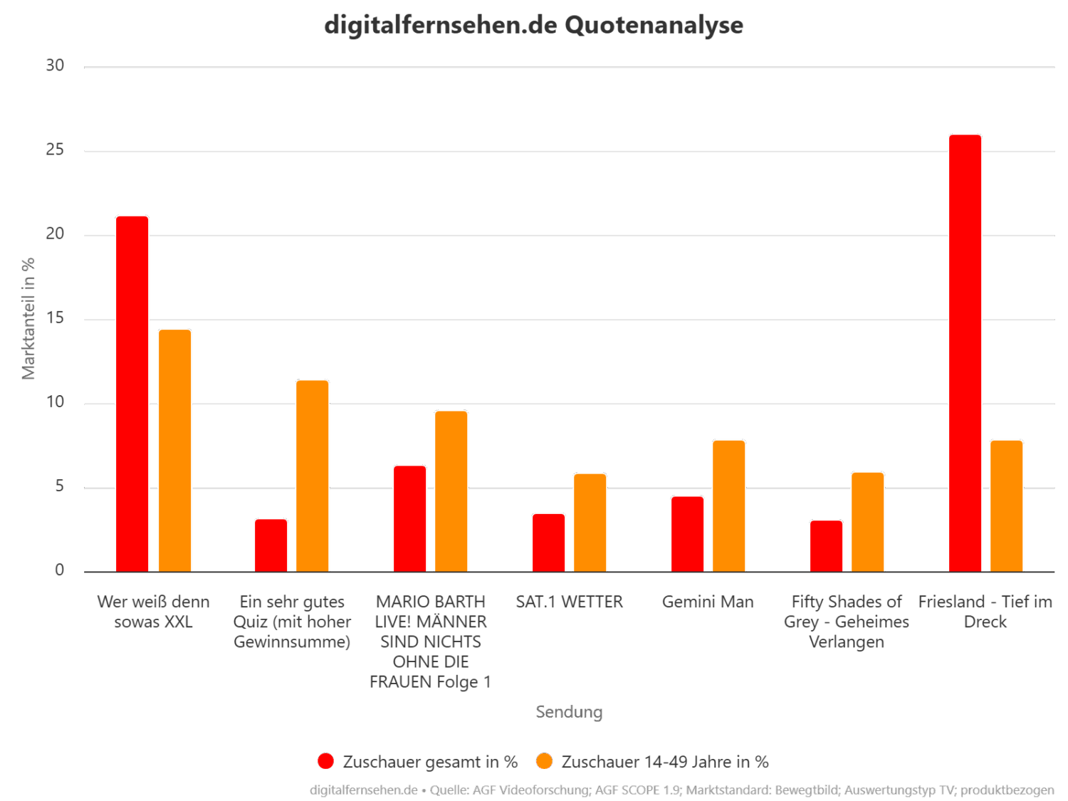 RTL zeigte ab 20:15 Uhr „Mario Barth live“ und kam nur auf 9,6 Prozent. Im ZDF lief „Friesland“ bei den Jungen mit 7,8 Prozent ordentlich. Der Primetime-Krimi siegte zudem bei allen Zusehenden: Die neue Folge sicherte sich ab 20:15 Uhr linear im Schnitt 5,83 Millionen Zusehende und somit 26 Prozent Marktanteil. „Fifty Shades of Grey“ holte bei Vox 5,9 Prozent in der klassischen Zielgruppe.