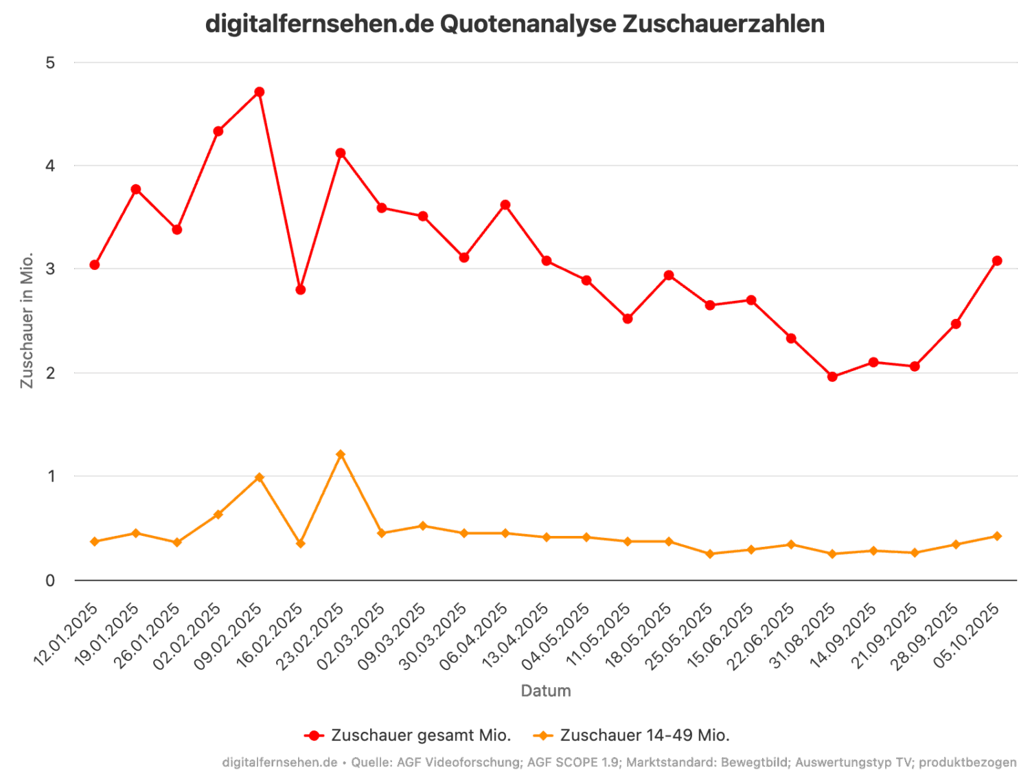 Quelle: AGF Videoforschung; AGF SCOPE 1.13; 05.10.2025; Marktstandard: Bewegtbild; Auswertungstyp TV; produktbezogen
