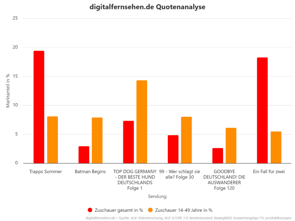 In Sat.1 überzeugte tagsüber unter anderem „Notruf“ um 17 Uhr mit schönen 9,9 Prozent. RTL kam „Barbara Salesch“ um 15 Uhr auf gute 10,7 Prozent. Ulrich Wetzel und „Der Blaulicht-Report“ hatten hingegen Probleme. Bei den 14- bis 49-Jährigen sicherten sich diese beide Formate 7,1 und 4,3 Prozent. Bei ProSieben überzeugte in der 17-Uhr-Stunde „taff“. Das Live-Magazin sicherte sich elf Prozent bei den Umworbenen. Abends sendete ProSieben den Film „Batman Begins“, der im Schnitt auf 7,9 Prozent kam. Somit lag er vor „Goodbye Deutschland“ von Vox: Die Auswanderer sicherten sich in der klassischen Zielgruppe am Freitagabend 6,1 Prozent.