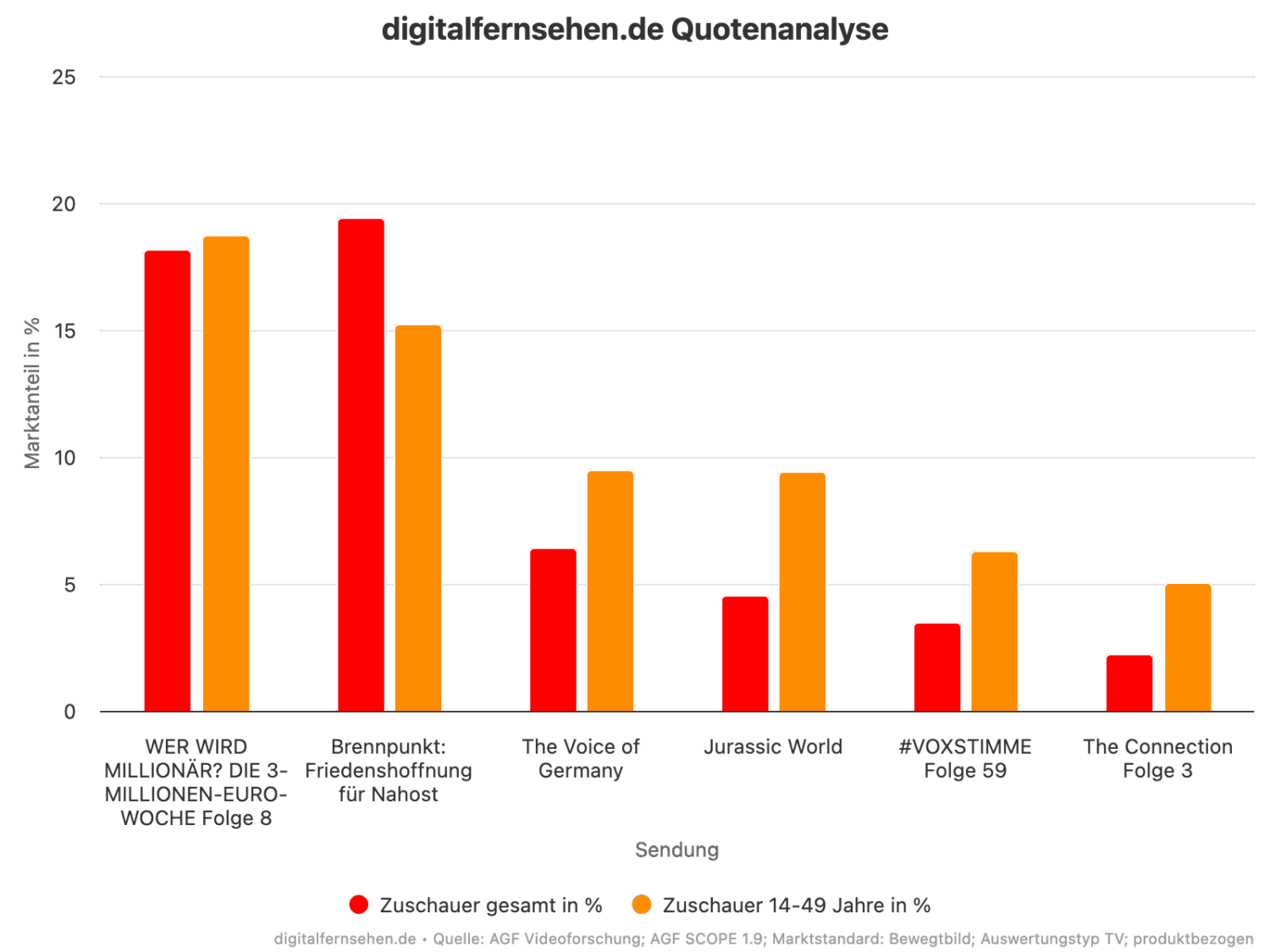 Starke Quoten, weil auf Augenhöhe mit „TVOG“, sicherte sich „Jurassic World“ zur besten Sendezeit bei Vox: Der Film erreichte bei den Jüngeren ebenfalls 9,4 Prozent. Insgesamt schauten etwas weniger zu als bei der Casting-Show: Der Film kam auf 0,97 Millionen, „The Voice“ auf 1,34 Millionen. Im ZDF meldete sich „Doktor Ballouz“ (wegen eines Newsspecials etwas verspätet) ab 20:30 Uhr und sicherte sich 2,58 und 2,56 Millionen Fans (11,3 und 11,7%). Im Ersten wurde ab 20:30 Uhr in Wien ermittelt. Ein „Wien-Krimi“ wurde mit Blick auf das Gesamtpublikum Marktführer: 4,6 Millionen Zusehende sorgten für schöne 20,8 Prozent. Ein davor gezeigter „Brennpunkt“ holte 19,4 Prozent.